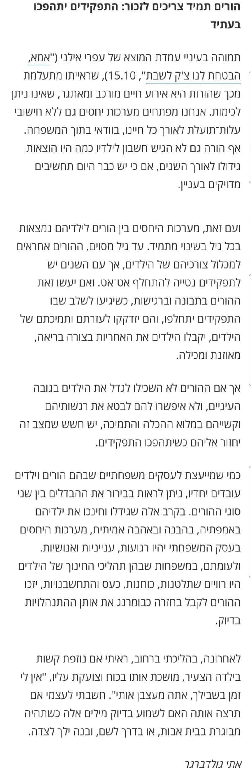 - הורים תמיד צריכים לזכור: התפקידים יתהפכו בעתיד – הארץ, תגובות הקוראים, 2021